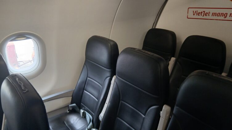 ノイバイ空港の国内線ターミナルは巨大だ。向かって左手がLCCのベトジェット。右手がナショナルフラッグキャリアのベトナム航空のカウンターが並んでいる。機内は搭乗率9割ほどか。かなり混んでいる。運よく3列席の窓側をゲット。左2席は空いており快適な空の旅に。旧正月が近いせいか、機内はカラフルなデコレーションが施されていた。