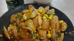 sò lụa xanhとはアサリのような二枚貝のこと。ガーリックバター炒めがおススメとか。量は少なめが50万ドン、多めが70万ドン。バターにバジル、黄色いのはトウモロコシの揚げたものだろうか。これがコリコリしていて非常に旨い。こってりしていてビールとよく合う。