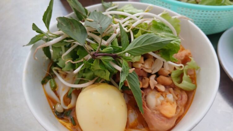 ダナンのビーチエリアにあるHA BONG通り周辺は表通り裏通りへ抜ける細い路地がたくさんあり、迷路のようだ。バンコクのカオサン通りも細い路地がいくつもあり、似たような雰囲気だ。名物麺料理のミークァンを注文した。5万ドン(330円)ただ、コン市場近辺の食堂に行けば、ミークァンは2万5000ドンほど。およそ2倍というわけだ。