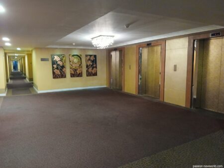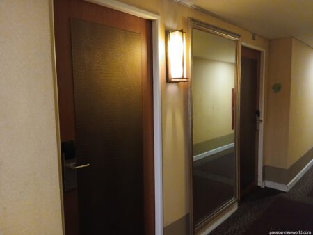 深夜3時のチェックインとなったが、フロントの女性スタッフは嫌な顔ひとつせず、にこやかに手続きをしてくれた。高層階を希望したところ6階の部屋となった。エレベーター前の廊下はかなり広い。