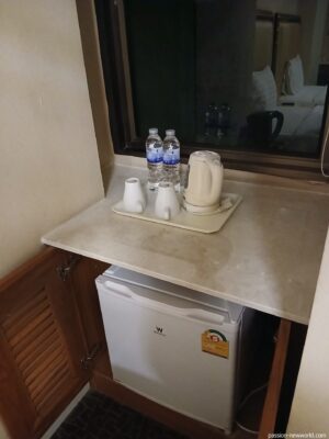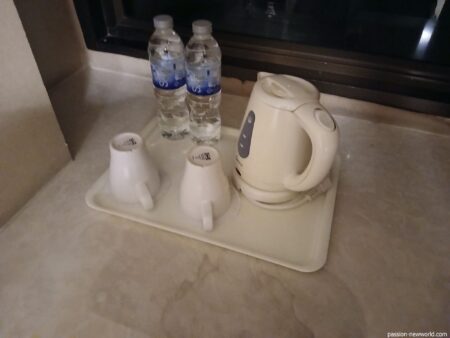 窓際にミネラルウォーター2本と電気ケトル。コーヒー類はない。