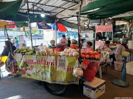 線路の下に椅子とテーブルが並んでいる。同じ構内には食堂がたくさんオープンしていた。これは安い。ひき肉ポークのオムレツライス(54番)が40バーツ。トムヤムクン(27番)が驚きの80バーツ!広々とした空間でトムヤムクンを堪能できるとは朝から幸せな気分になる。