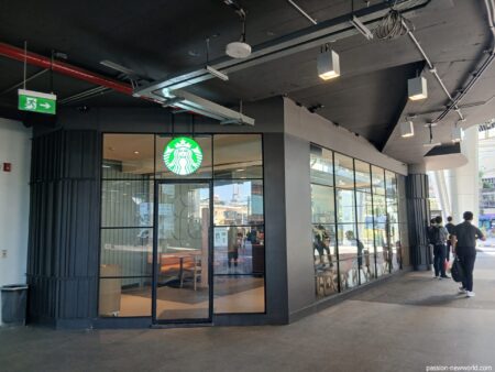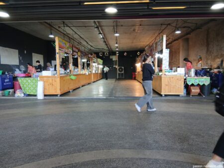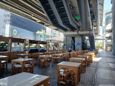 線路の下に椅子とテーブルが並んでいる。同じ構内には食堂がたくさんオープンしていた。
