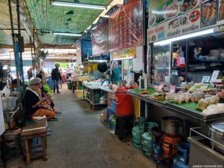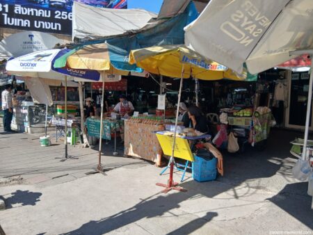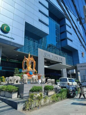 ラムカムヘーン駅隣接のホテル「NASAバンコクエアポートレイルリンク」に宿泊。翌朝、朝食を求めて周辺を散策した。線路を渡るとこのUMタワーのビルがあり、その向かって左側に在来市場が広がっていた。