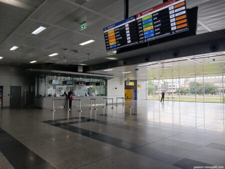 がらーんとしている駅構内。やたらだだっ広い。電光掲示板を見ると、午後3時10分発の列車がある。チケットはこちらの窓口で購入。パスポートの提示が必要。