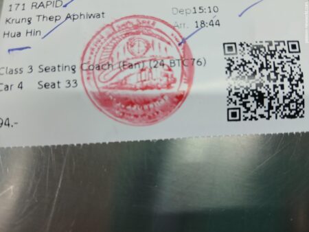 171のRAPID。料金は94バーツ(約400円)。3等車なので全席自由席かと思ったら、きちんと座席指定されている。4号車の33番。ホアヒン駅着は午後6時44分。約3時間半の旅となる。