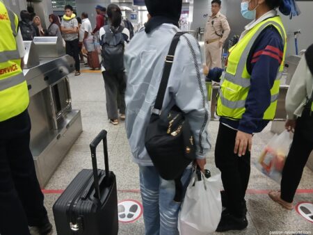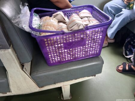 こちらは紙にくるんだミニパッタイ。1個10バーツと安いが、本当に一口サイズ。隣席の乗客は5個まとめて買っていた。
