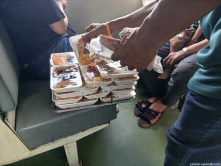 列車は定刻通りに出発。すぐに車内販売が次から次へとやってくる。こちらはオムレツ弁当、40バーツだ。