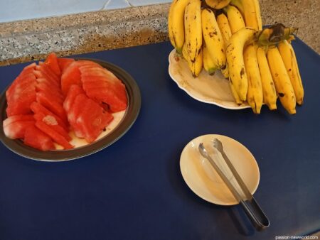 入り口すぐ左手にフルーツと野菜のコーナー。バナナとスイカがたっぷり。