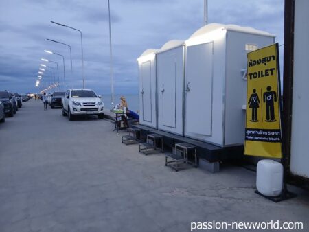 さらに行くと防潮堤のような建築物が。そのまま海の方へ歩いていく。有料トイレがある。大勢の人が奥の方へと歩いていく。いったい何があるのか?
