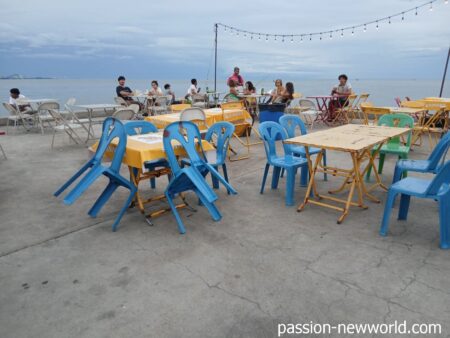 海を眺めながらこちらのテーブルで食べることに。潮風が気持ちいい。