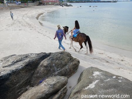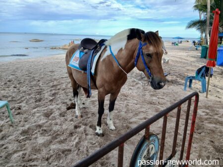 呼び込みの声を聞こえないふりをして通り過ぎると、ホアヒン名物の馬がいた。家族連れに大人気のビーチ乗馬。値段は20分が300バーツ、30分が400バーツ、60分が800バーツだ。1時間も駆け回るほどの広さはないので、20分あれば十分か。