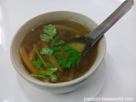 さて、スープは茶色い醤油ベースで透明。香菜(パクチー)は適量で良いスパイスとなっている。