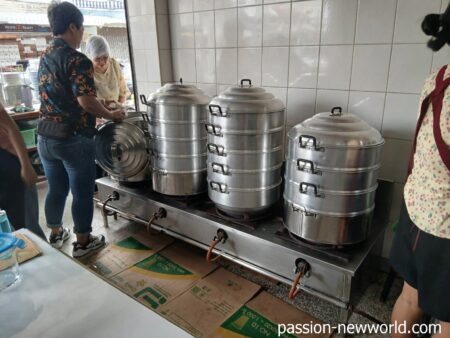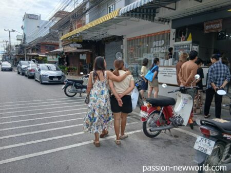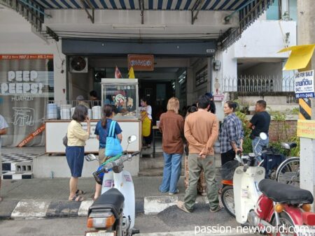午前8時ごろ。朝食を物色するためホアヒンの中心エリアを歩いていたら、朝から大混雑の店を発見。「Lom Huan Kaow Man Gai」だ(グーグルマップ上の名前)。