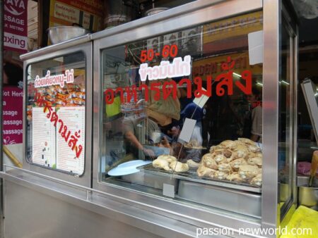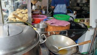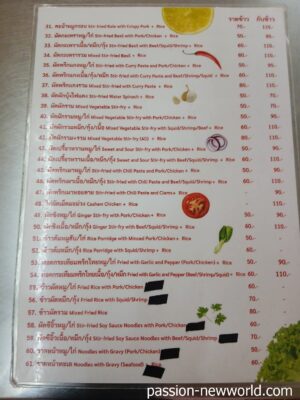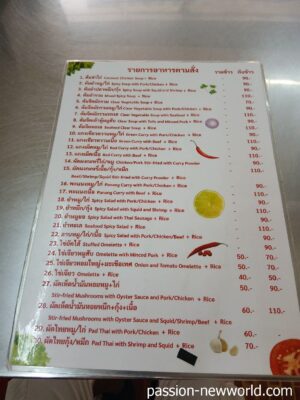 「名無し食堂」として旅行者の間でつとに有名な食堂。その名も「名無し食堂」。名前がないからといって料理まで“味気ない”というわけでは決してない。欧米系の旅行者は壁に張ってあるメニューの上の方から注文しているようで、だいたいカオマンガイか麺類であるところのクイッティヤオを食べている。しかし、よくよくメニューを眺めていると、美味しそうな料理がけっこうズラリと並んでいるのだ。