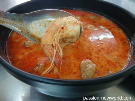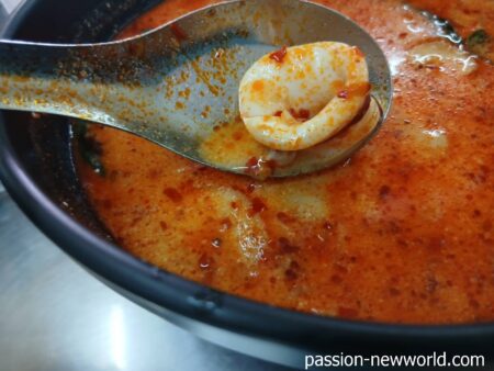 粒よりのエビがゴロっと入っている。スープは真っ赤。まさにトムヤムクン。スープはねっとりしていてほどよい刺激。下に絡みつく辛味に混じって香辛料の酸味、甘味、旨味が溶け合っている。いい味だ。