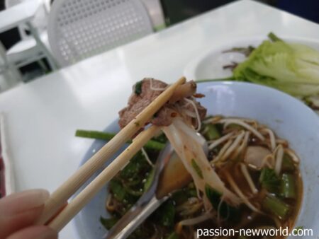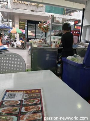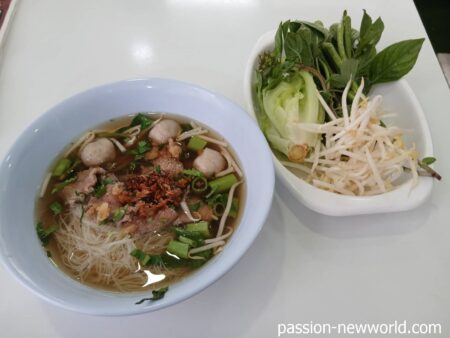 50バーツ(約220円)のクイッティヤオに野菜を付けているのは、かなりお得感がある。オープン仕立てなのか、白を基調とした店内は清潔感があり、居心地が良い。