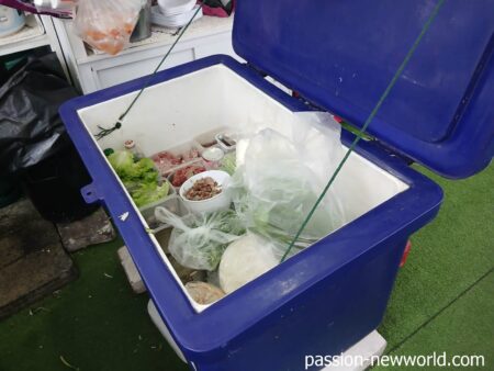 食材が店内中央の大型クーラーボックスの中にコンパクトにまとめられていた。