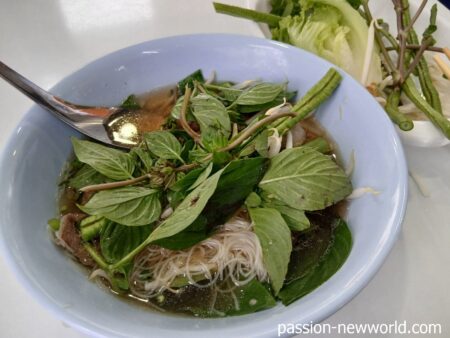 茶色く澄んだスープにビーフン。牛肉もそこそこたくさん入っている。日頃、不足しがちな葉っぱを大量投入してスプーンで口へ運ぶ。ハーブの若々しい香りとスパイシーな風味が口中に広がる。これぞ、南国の料理だ。スープはすっきりした味わいなので、味変のため途中で唐辛子を投入。おー、パンチが増して旨さが際立つ。