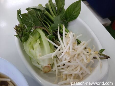 目の前のソイ・ブアカオを眺めていると、すぐに深皿に盛られた野菜が登場。もやし、サニーレタス、ホーラパー(タイのハーブ)がたっぷり。
