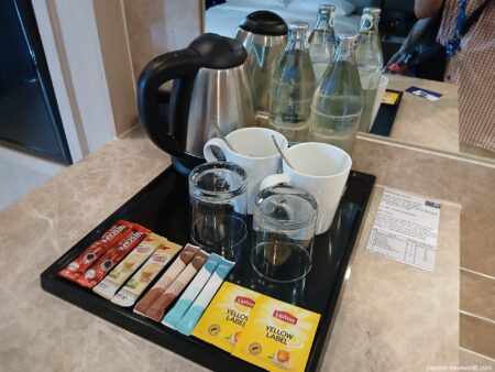電気ケトルと無料のミネラルウォーター。コーヒー、紅茶がそろっている。