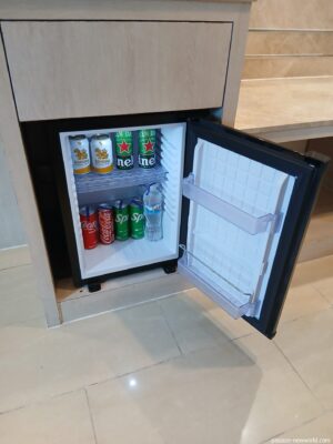 冷蔵庫はかなり小さい。中にあるドリンク類は有料。
