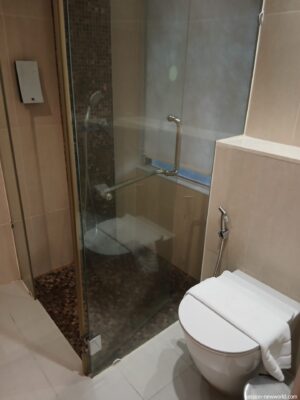 水回りは、というと、トイレとシャワー室の間にガラスの仕切りがあるため、トイレがびしょ濡れになる心配はない。