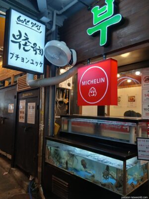 ソウルの人気観光地でもある広蔵市場にある細いユッケ通りはいつも大勢のお客さんで賑わっている。その中でもいつも行列ができているのが「プチョン(富村)」ユッケだ。入り口左にある赤いミシュランの掲示物が誇らしさをアピールしている。