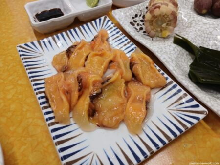 結果、ホヤと刺身盛り合わせに決めた。前々から食べたかったのはセコシ。小骨を包丁で丁寧に切り刻んで調理する珍しい刺身で、小骨のコリコリ感がたまらない。店主と相談したところ、「刺身盛り合わせの中にセコシを入れてあげるよ」とうれしいオファーが。