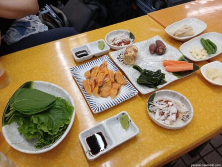付け合わせはトウモロコシ、ふかしたサツマイモ、ニンジン、昆布。生ニンニク、青唐辛子は定番。野菜はえごまの葉っぱとサンチュ類がたっぷり。もちろんお代わり自由だ。