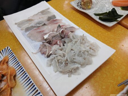 こちら刺身盛り合わせのいちばん手前がセコシ。魚は計4種類。うち1種がセコシというわけだ。