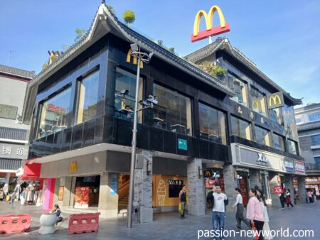 このお城風のマクドナルドがランドマーク。周囲には無数の飲食店があり、多くの歩行者が食べ歩きしている。