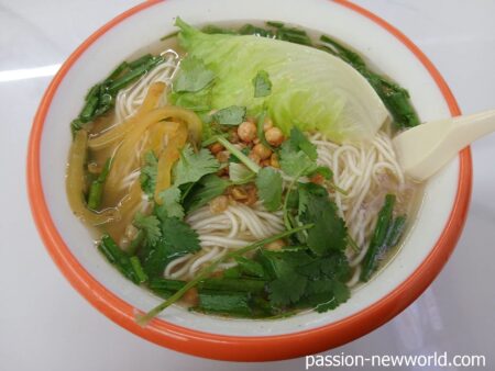 出てきたのがこれ。薄味スープに腰のある麺、上にはレタス、パクチー、大根のピクルスのようなもの。丸い物体はトウモロコシの粒を素揚げしたもののようだ。口の中でコリコリ弾けて旨い!
