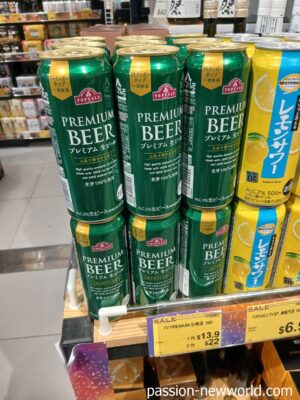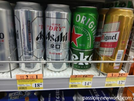 イオンモール内で見つけた「プレミアムビア」。こちらは日本の「イオン」や「まいばすけっと」とほぼ同じ値段。1缶13.9香港ドルだが、2缶買うと22香港ドルで440円。