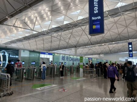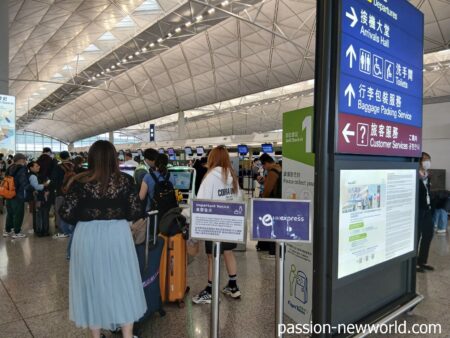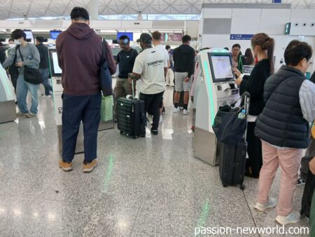 空港に到着後、香港エクスプレスの発券カウンターへ。搭乗者のほとんどがセルフチェックインを利用している。操作が分からない場合、スタッフがすかさずアシストしてくれるので心配はない。