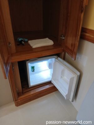 冷蔵庫はキャビネットの下。清潔でまったく問題なし。