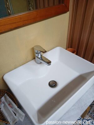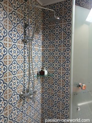 室外のようで室内のようでもある。アメニティーは歯ブラシとくし。小さな固形石鹼。シャワーを浴びるとトレイが濡れるのは致し方ないか。