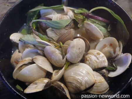 このsoupが濃厚で複雑な味わいだ。魚醤、酒、玉ねぎ、ネギ、唐辛子、ハーブなどの味わいが溶け込んだようなまろやかながらパンチの効いた風味。また、貝の量がハンパなく多い。