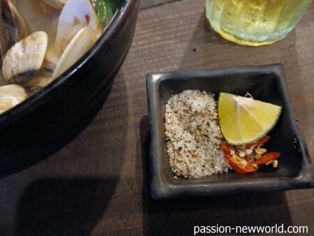 ライムを塩にかけて混ぜ、貝をそれに付けて食べるのだそうだ。ただ、スープにすでに塩味がついているので、特に使わなくても大丈夫。