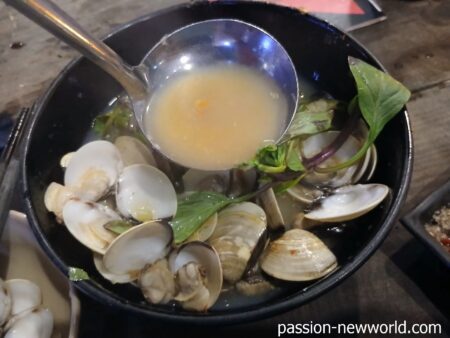 soupが濃厚で複雑な味わいだ。魚醤、酒、玉ねぎ、ネギ、唐辛子、ハーブなどの味わいが溶け込んだような風味。また、貝の量がハンパなく多い。おつまみが旨すぎて結局、1ℓ缶2本を飲み干した。