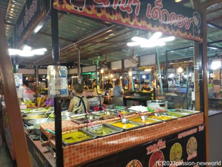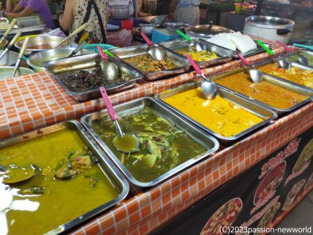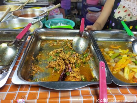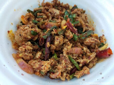 ブアカオ常設市場のカレー屋台飯「ナナカレー」。今回はタイ東北部イサーン地方の家庭料理である「ラープガイ」を食べてみた。