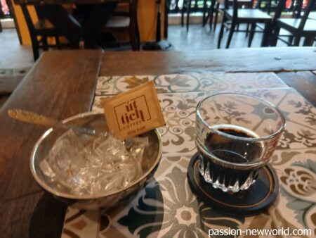 ベトナムコーヒーは2万5000ドン、150円。氷を入れてアイスコーヒーにして飲んでみる。ベトナムコーヒーらしい濃厚な味わい。どこかチョコレートの風味が漂っている。