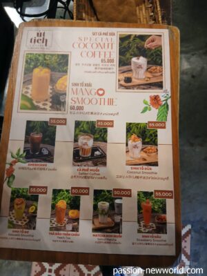 メニュー。マンゴーのスムージ―が6万5000ドン、386円だ。