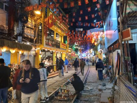 両替を終えてハノイ名物線路カフェへ。列車が運行時は危険極まりない。