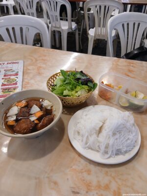 迷った挙句にブンチャーを注文してみた。5万ドン。5分ほどで運ばれてきた。ブンチャーとは豚肉のハンバーグやカリカリに焼いた肉を甘いスープの中に入れ、つけ麺のように麺をひたして食べる麺料理。