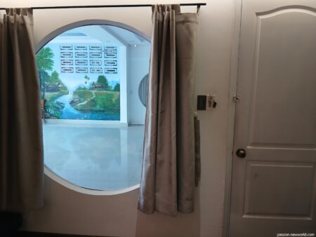 部屋の難点は窓。廊下に面したこの丸い窓しかない。