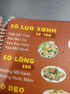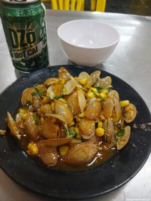 sò lụa xanhとはアサリのような二枚貝のこと。メニュー1番上はタイ風レモングラス蒸し。2番目はガーリックバター炒め。これがおススメとか。量は少なめが50万ドン、多めが70万ドン。
