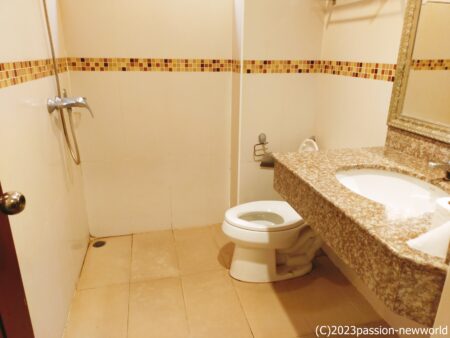 洗面化粧台はこんな感じ。シャワーを浴びるとトイレも水浸しになるのはパタヤ定番のあるあるです。