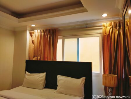 予約したスタンダードルームは20 m²でクイーンベッド 1台。管理人は窓からの眺望をホテル選びの最優先事項としているが、不覚にもこのホテルについてはリサーチ不足だったか。カーテンを開け、そして窓を開けるとすぐ隣のアパートメントの壁が目の前に。これは残念。部屋もパタヤにしてはかなり狭い。まあまあ清潔に保たれているが、清掃は細部までは行き届いていない。