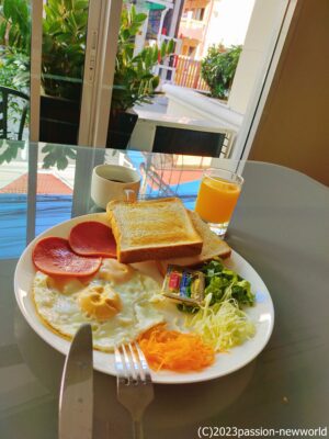 トースト2枚にバターと目玉焼き2つ。キャベツ、レタス、ニンジン、そしてハム2枚。値段相応で質素ではある。コーヒーは飲み放題。